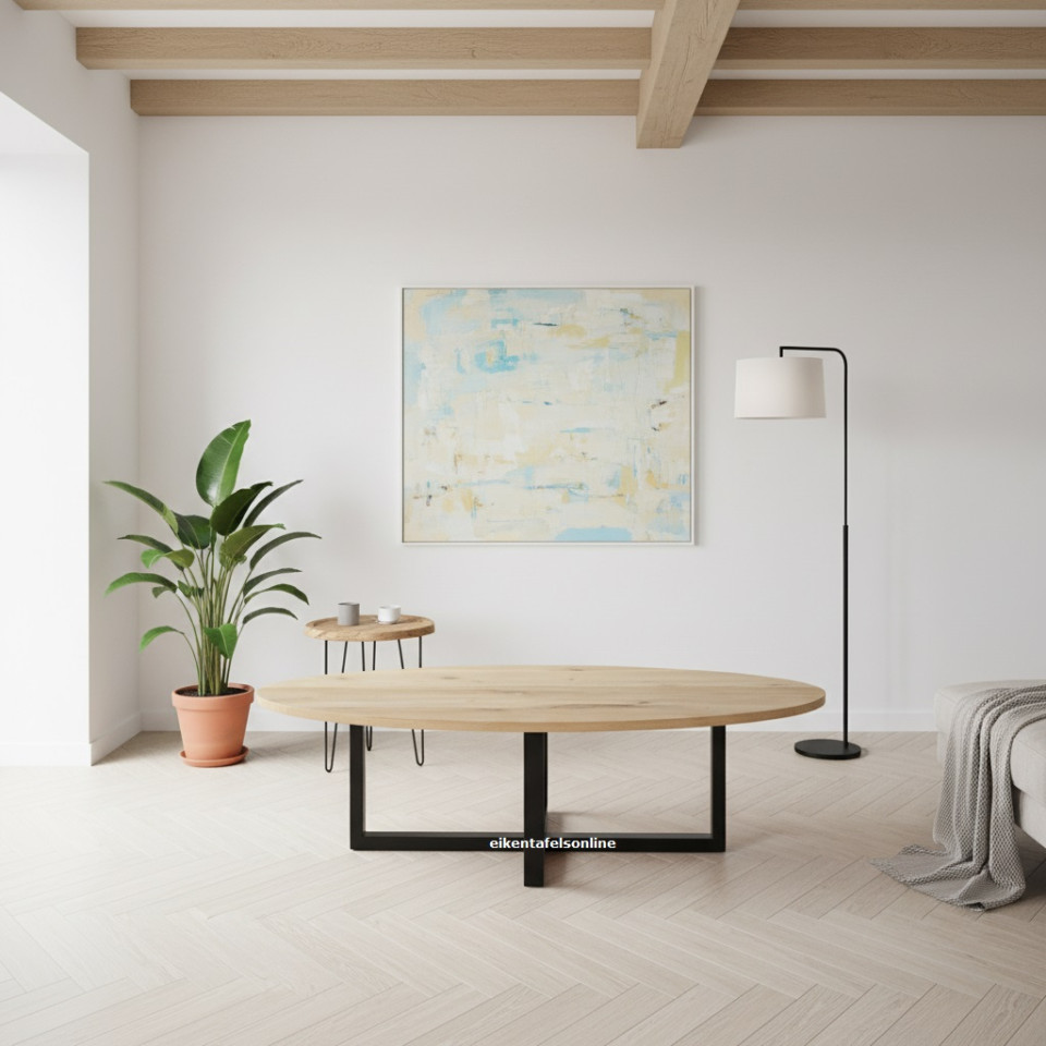 Eiken tafel ovaal met een metalen dubbel U onderstel. Een stevige middenpoot bestaande uit 2 U poten gekruist op elkaar gelast. Tafelblad van 4 cm dik. Europees eikenhout.