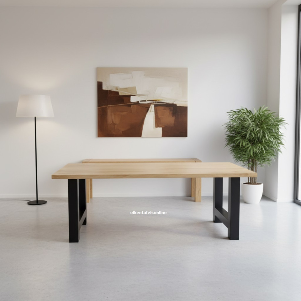 Rustieke eiken tafel met een massief blad van 4 cm dik. Hoge kwaliteit Europees eikenhout. Daaronder een metalen onderstel in H vorm, kokermaat 10x10. Mooi onderstel van metaal in de vorm van de letter H. Tafel voor woonkamer, keuken of kantoor.